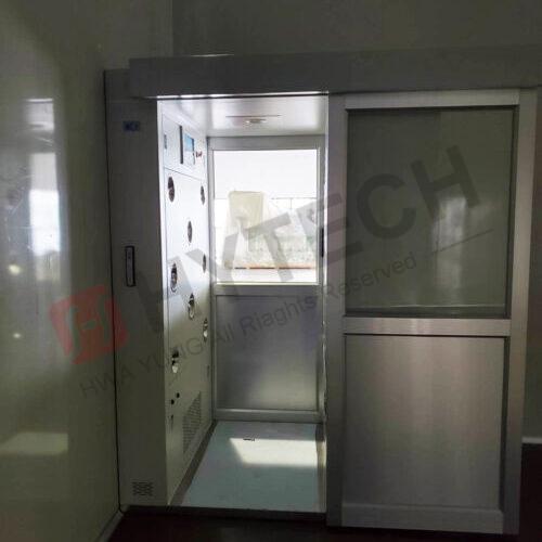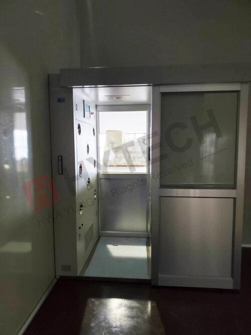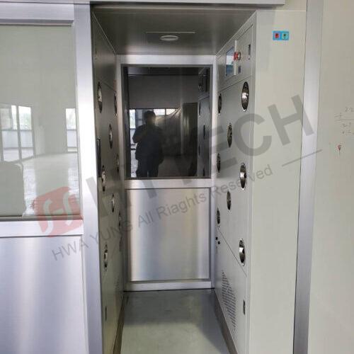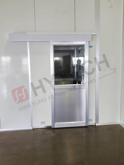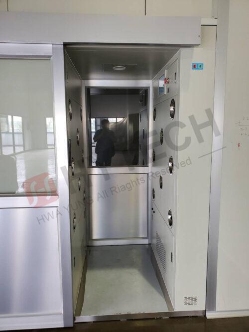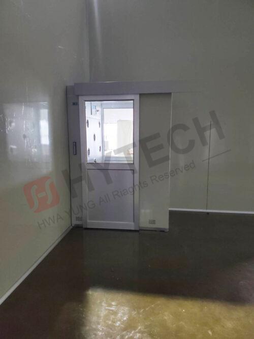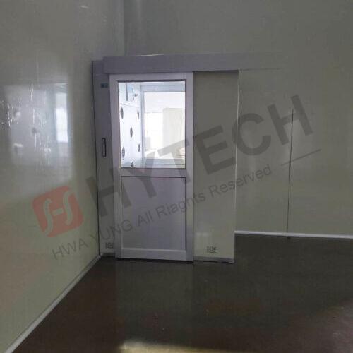 浴塵室內部採鋼板珍珠白烤漆精簡美觀,進出使用按鈕開關自動門,且使用輕盈的鋁門材質,降低功耗,節能省電。