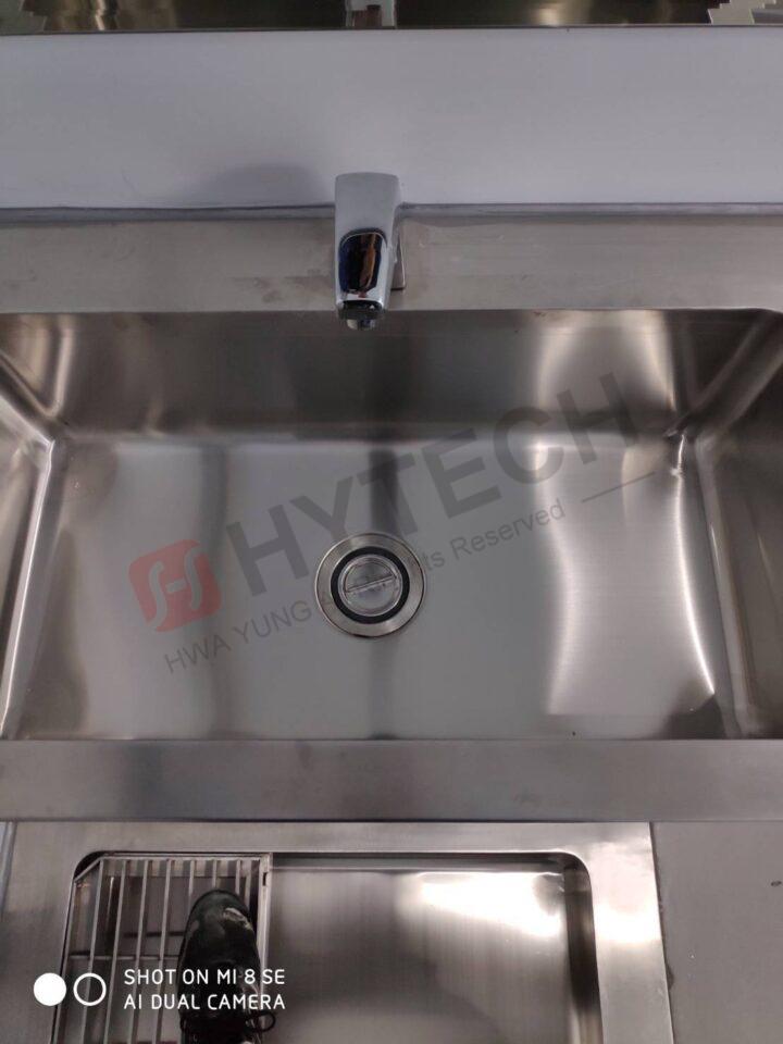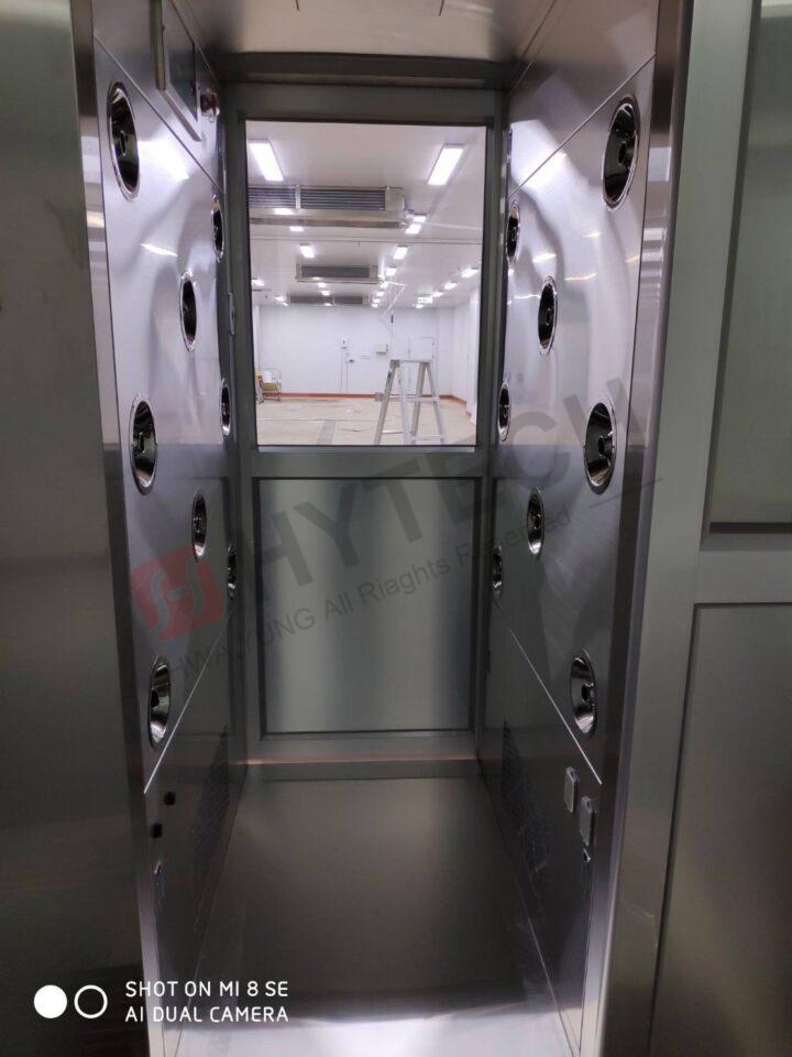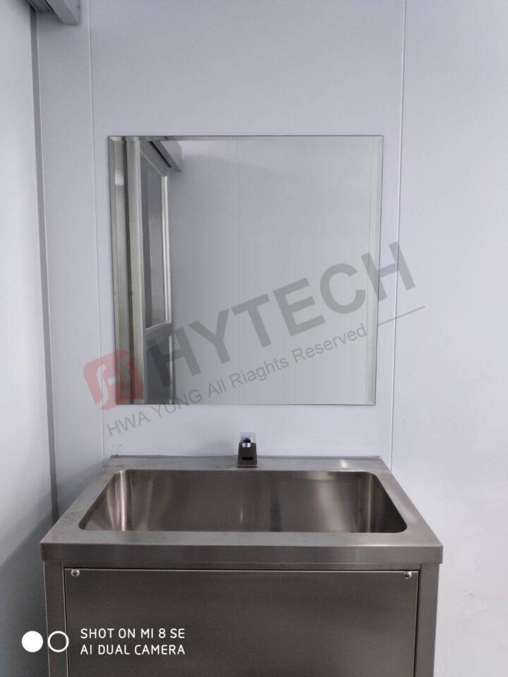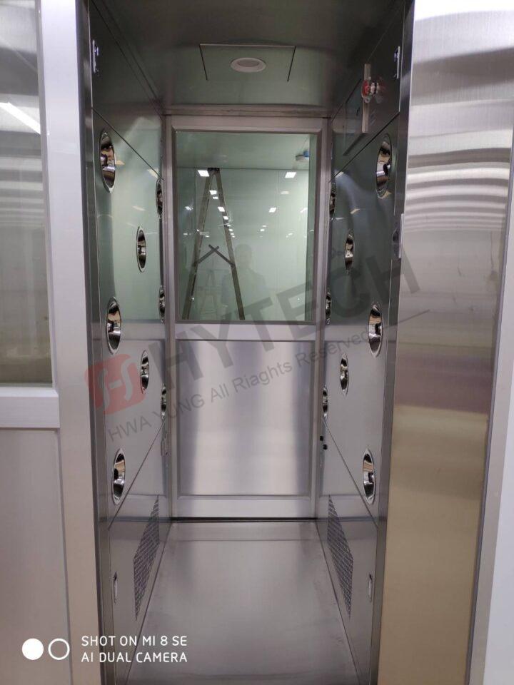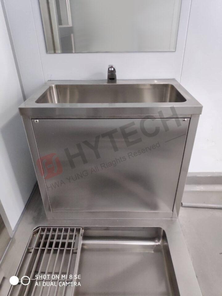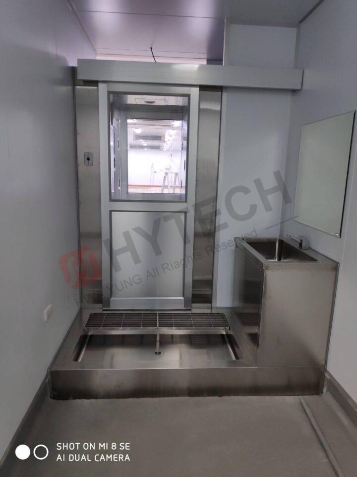 不鏽鋼烤材質,適用食品產業,除原本浴塵室功能,並依客戶需求,加裝泡鞋池、洗手槽。